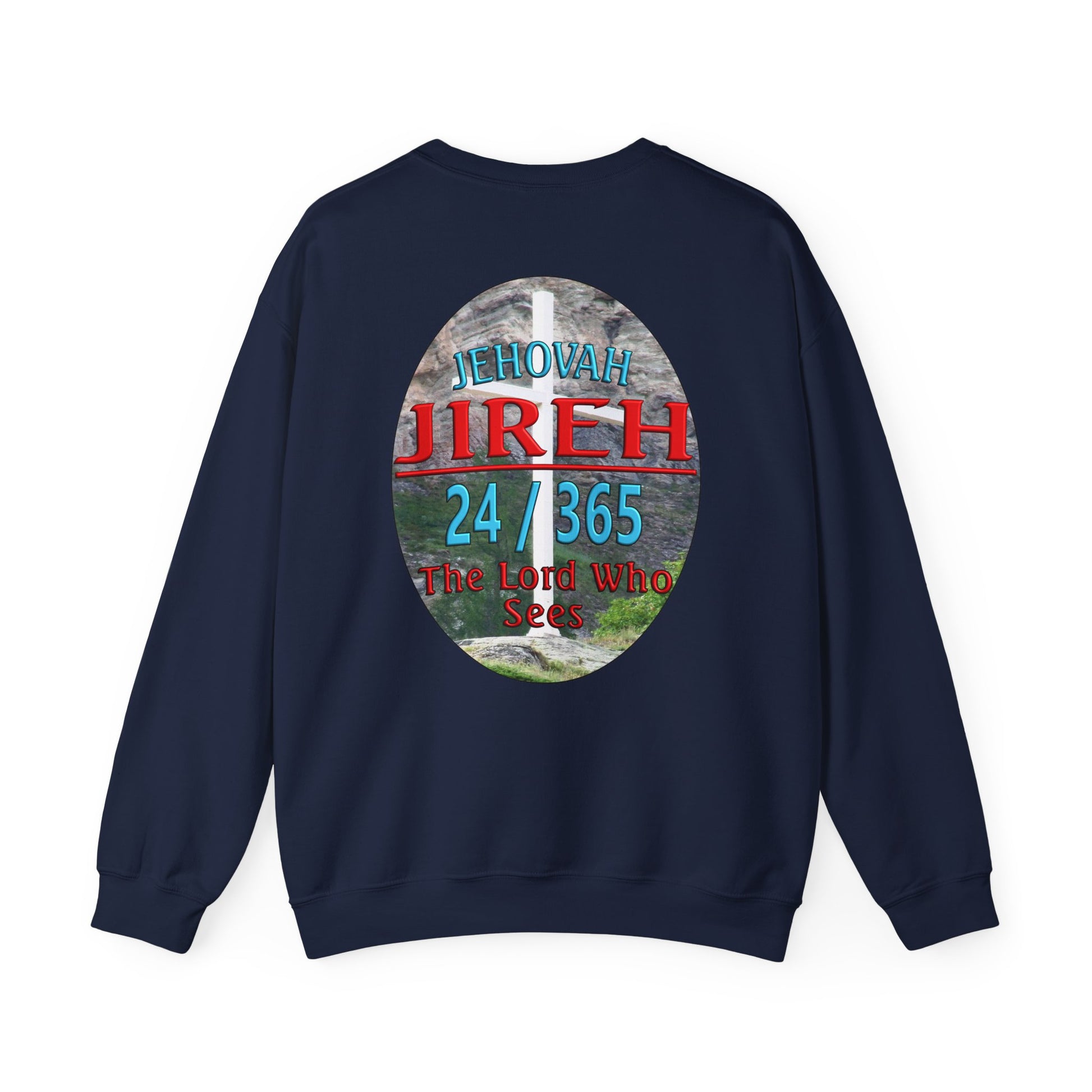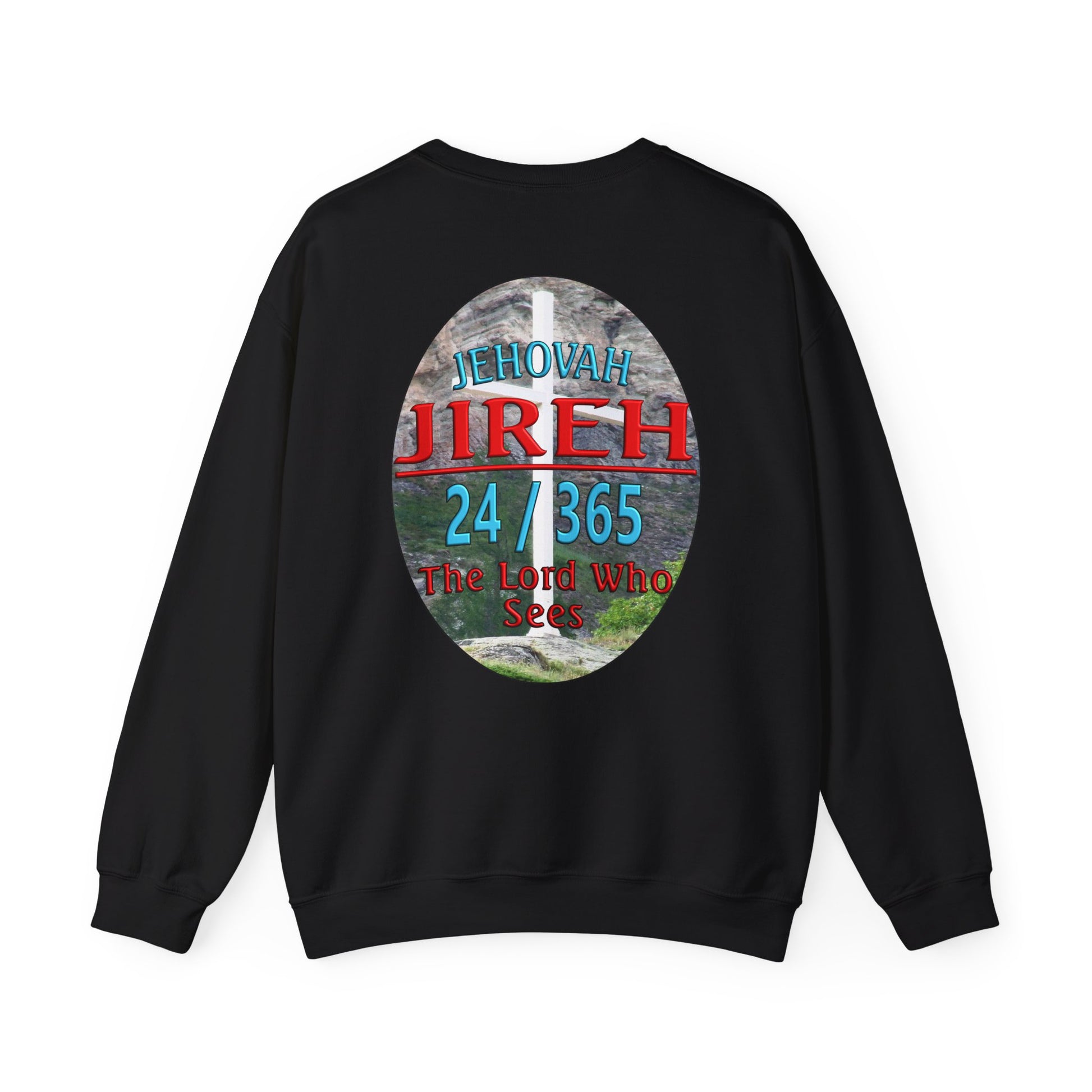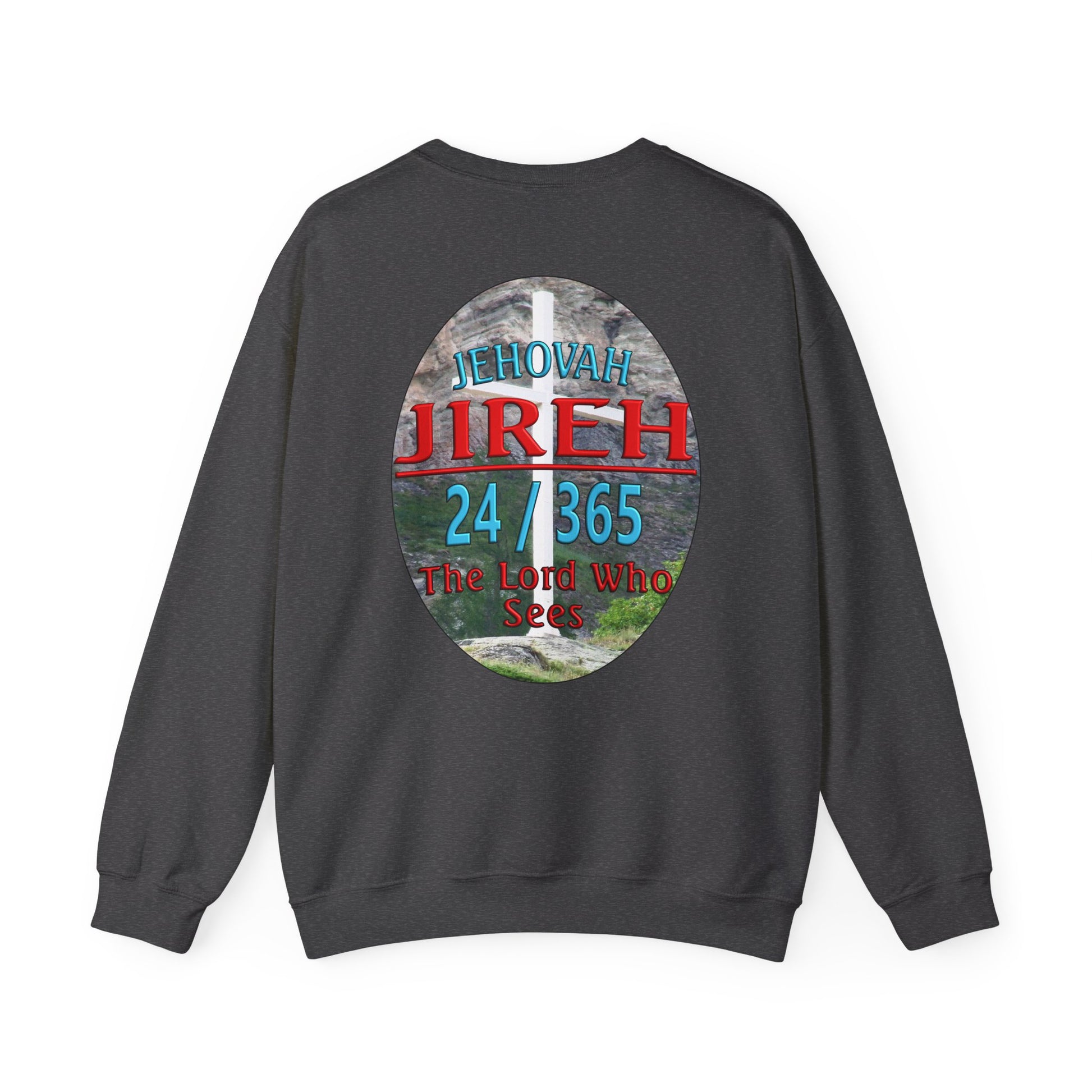 This Sweat shirt reflects the combination of Jehovah with the word "Jireh". “Jireh” means “sees”. It means the eternal God is watching and noticing all that is going on. Nothing ever escapes His notice or attention. It also means that Jehovah is forever watching over us. He is continually watching and preparing His provision for what we face 24-365. There is no point during the day or throughout the year when He is not watching and providing for us.