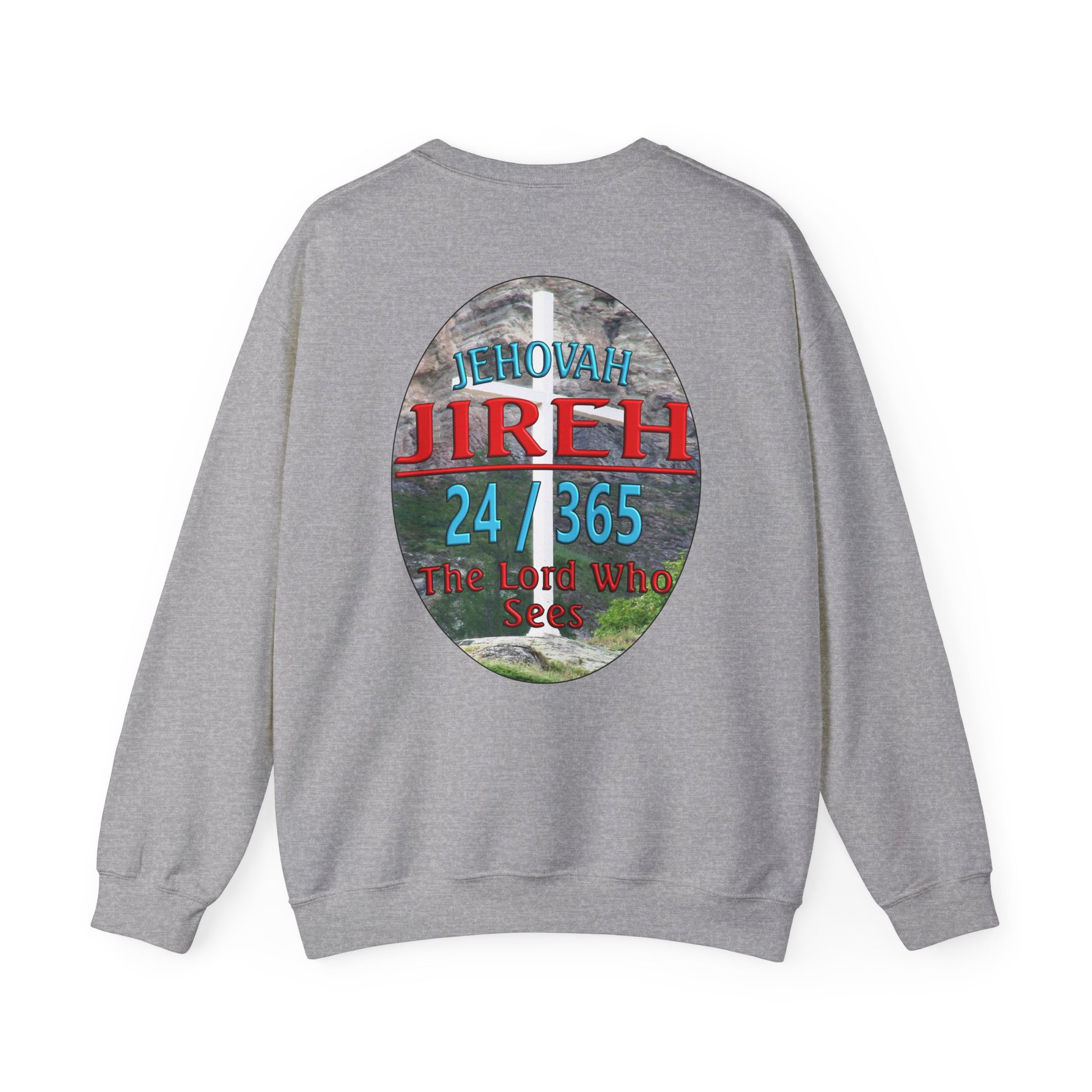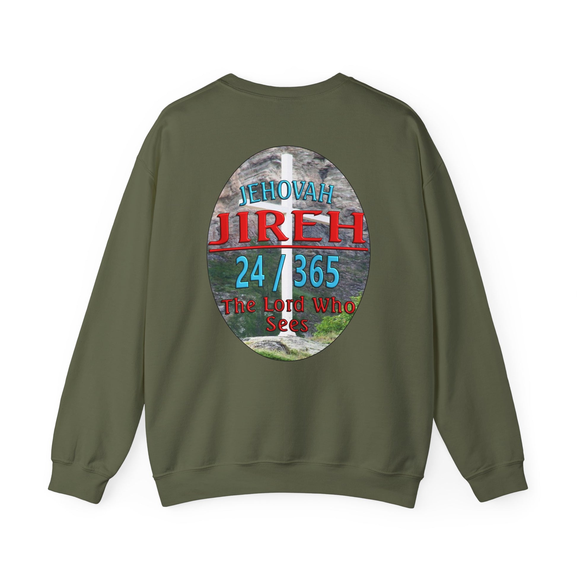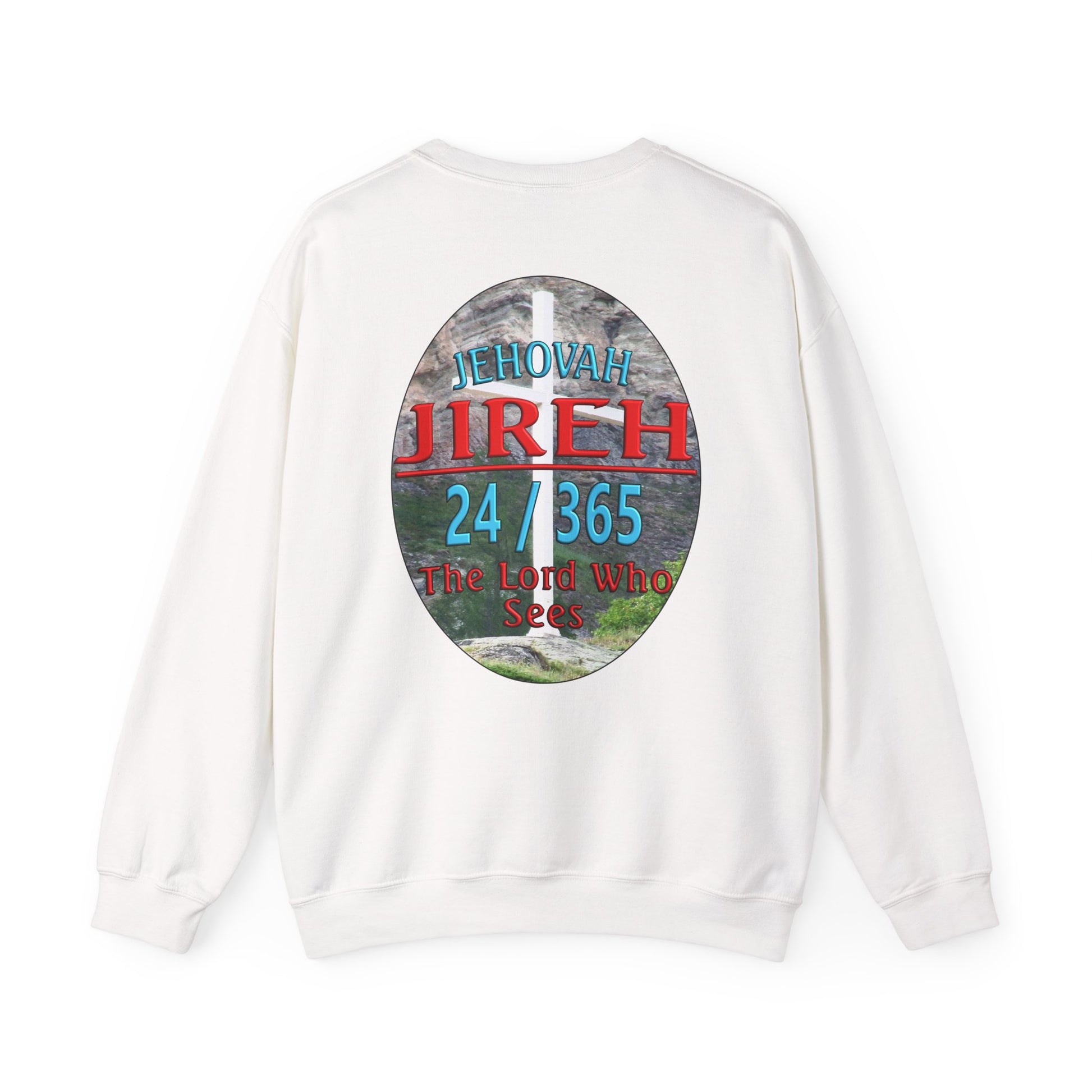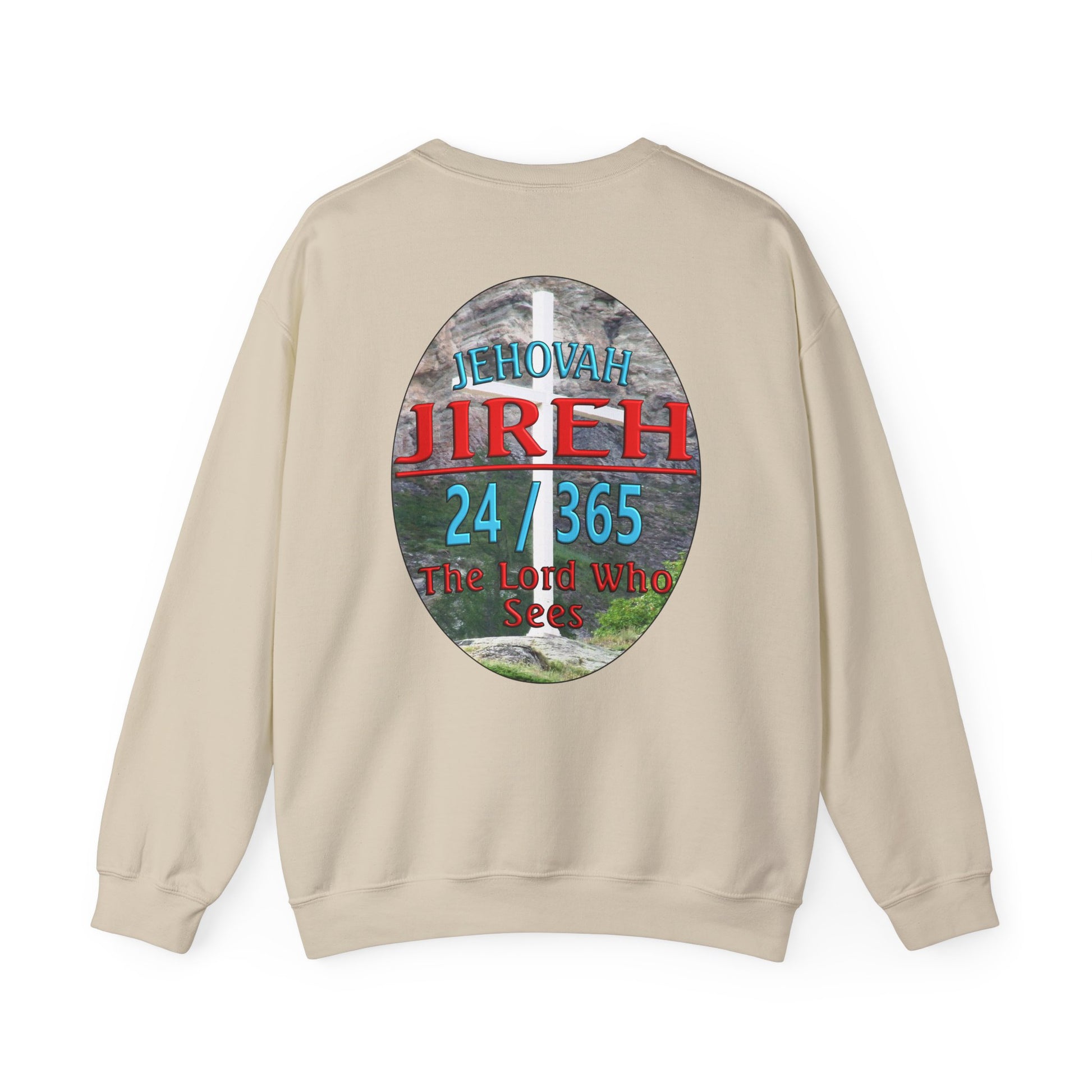 This Sweat shirt reflects the combination of Jehovah with the word "Jireh". “Jireh” means “sees”. It means the eternal God is watching and noticing all that is going on. Nothing ever escapes His notice or attention. It also means that Jehovah is forever watching over us. He is continually watching and preparing His provision for what we face 24-365. There is no point during the day or throughout the year when He is not watching and providing for us.