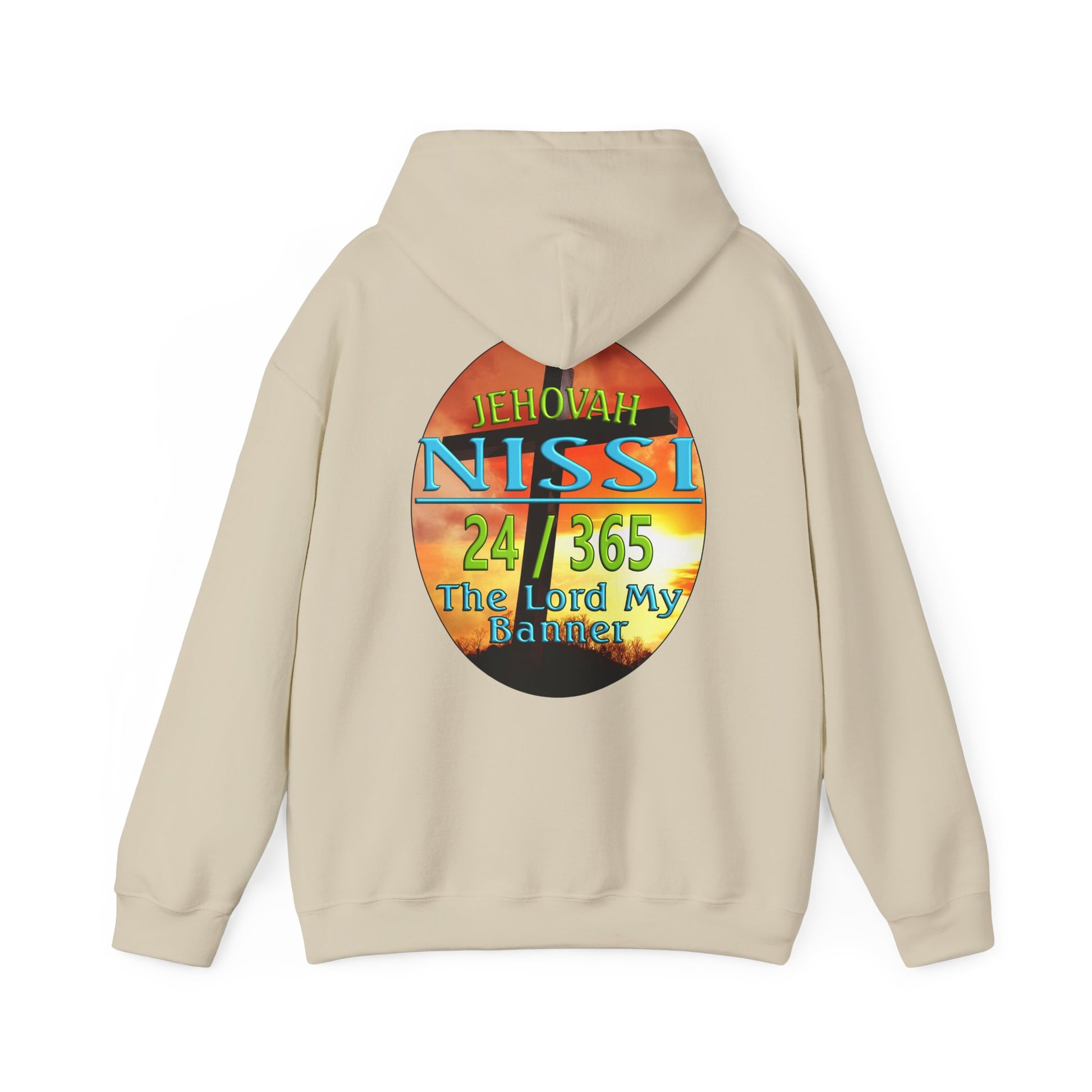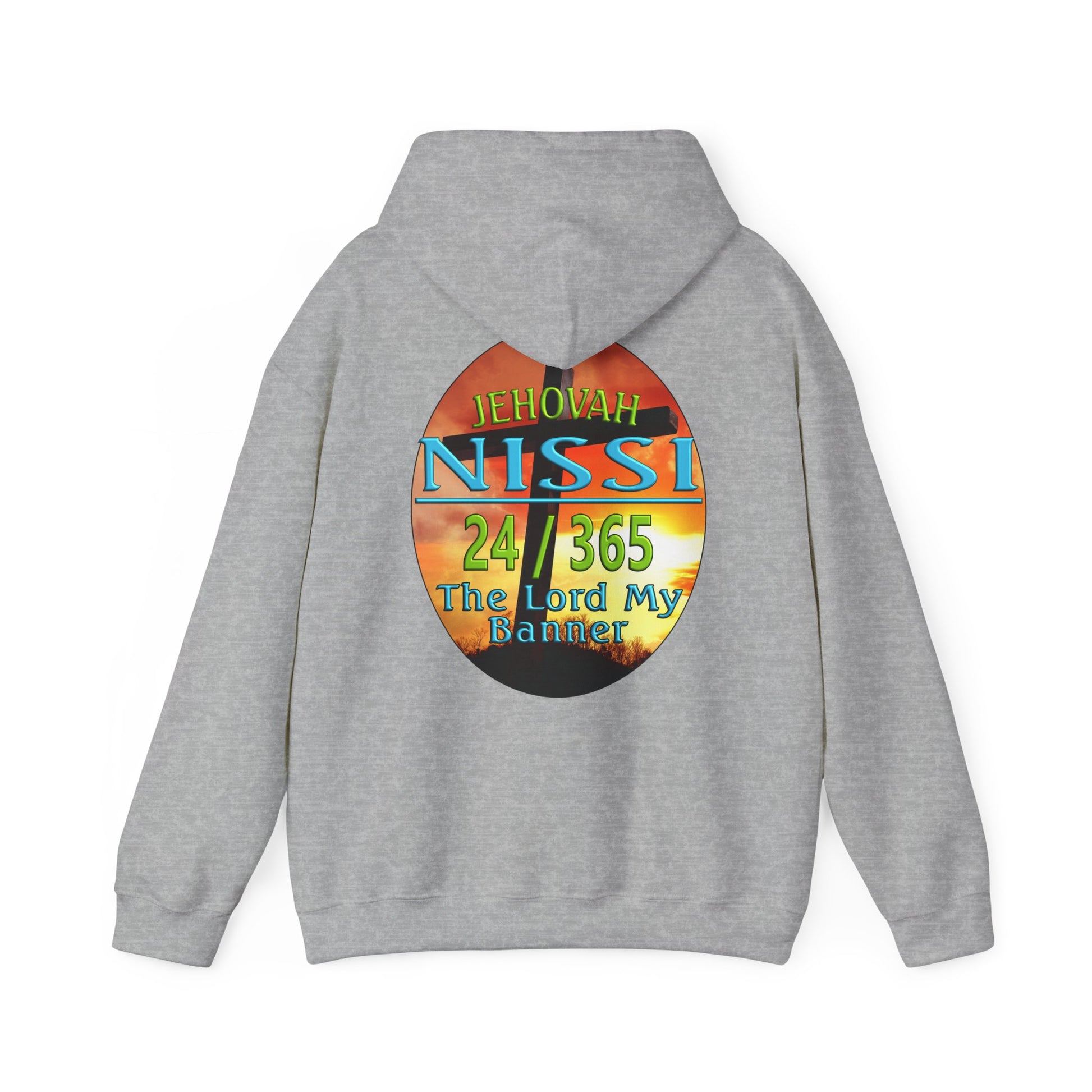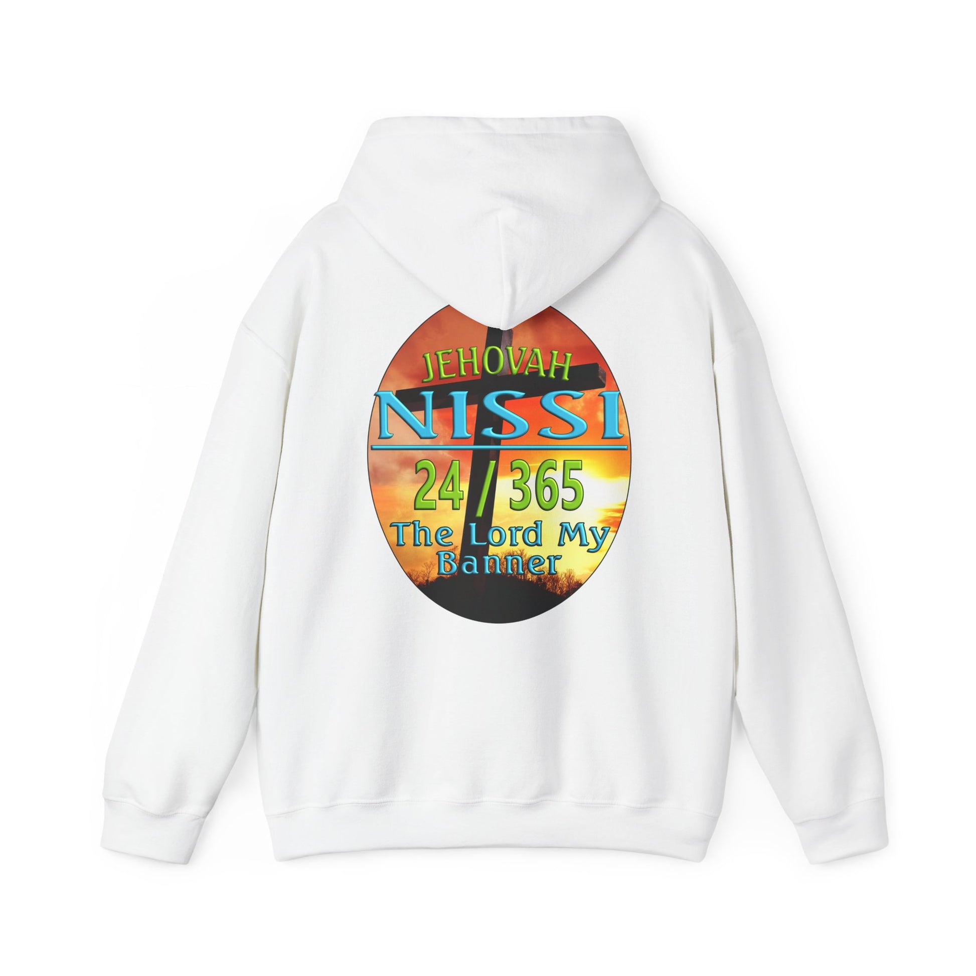 This Hoodie reflects the combination of Jehovah with the word "Nissi". “Nissi” means banner. Banner here is much like a flag. A flag is a representation of what we hold dear and we govern our lives to adhere to its ideals and values. We live under the direction and in the defense of that which the banner represents. In this case our banner is the Lord.