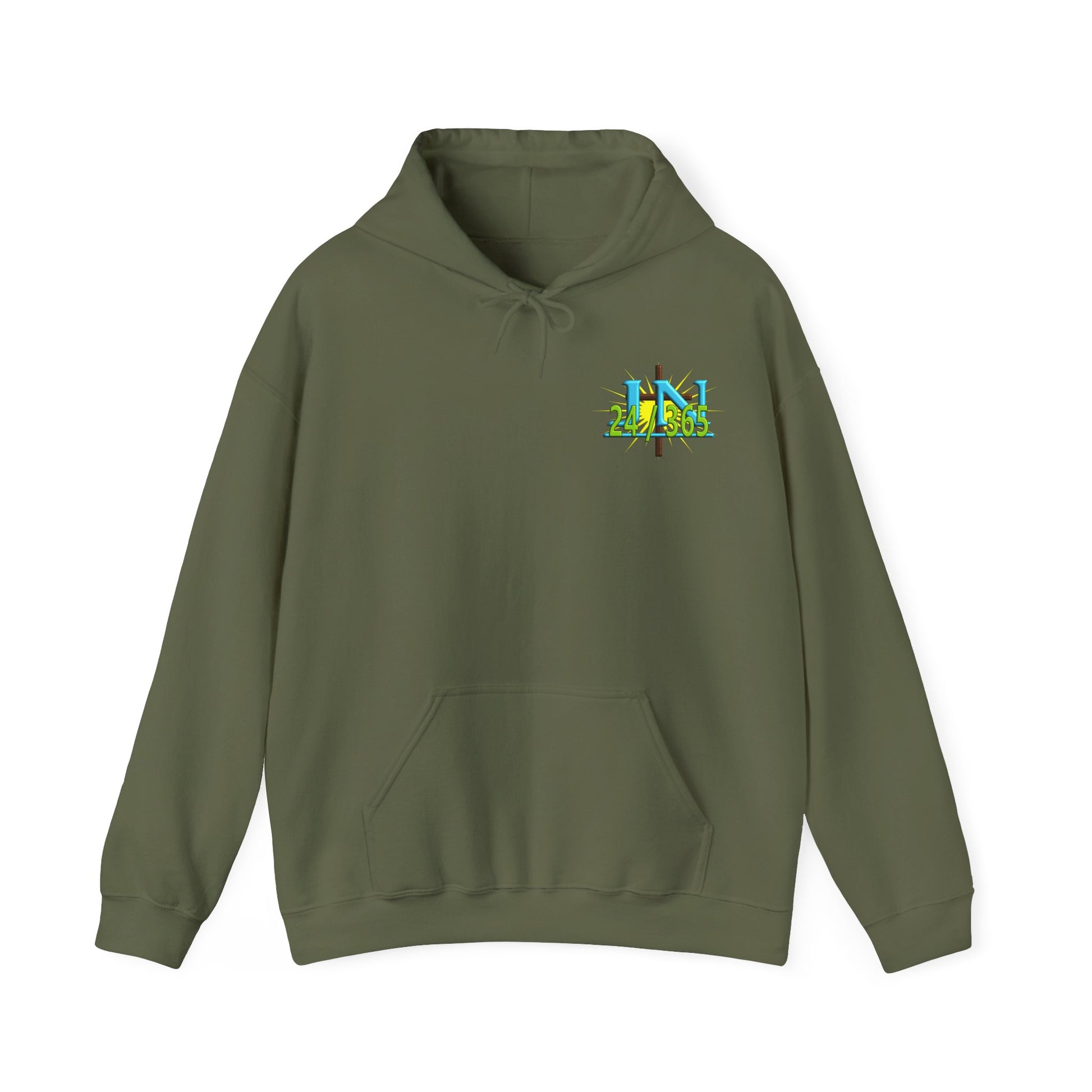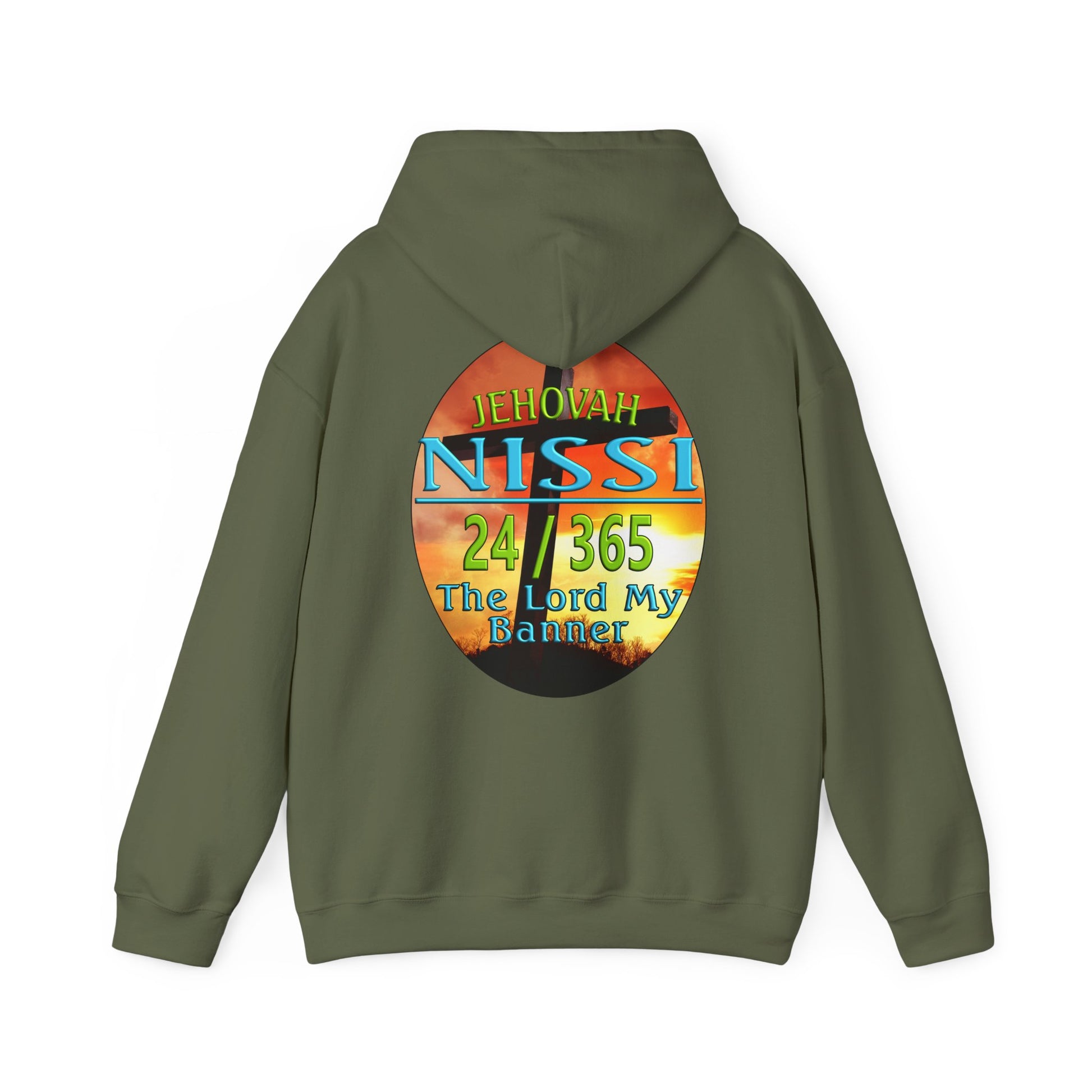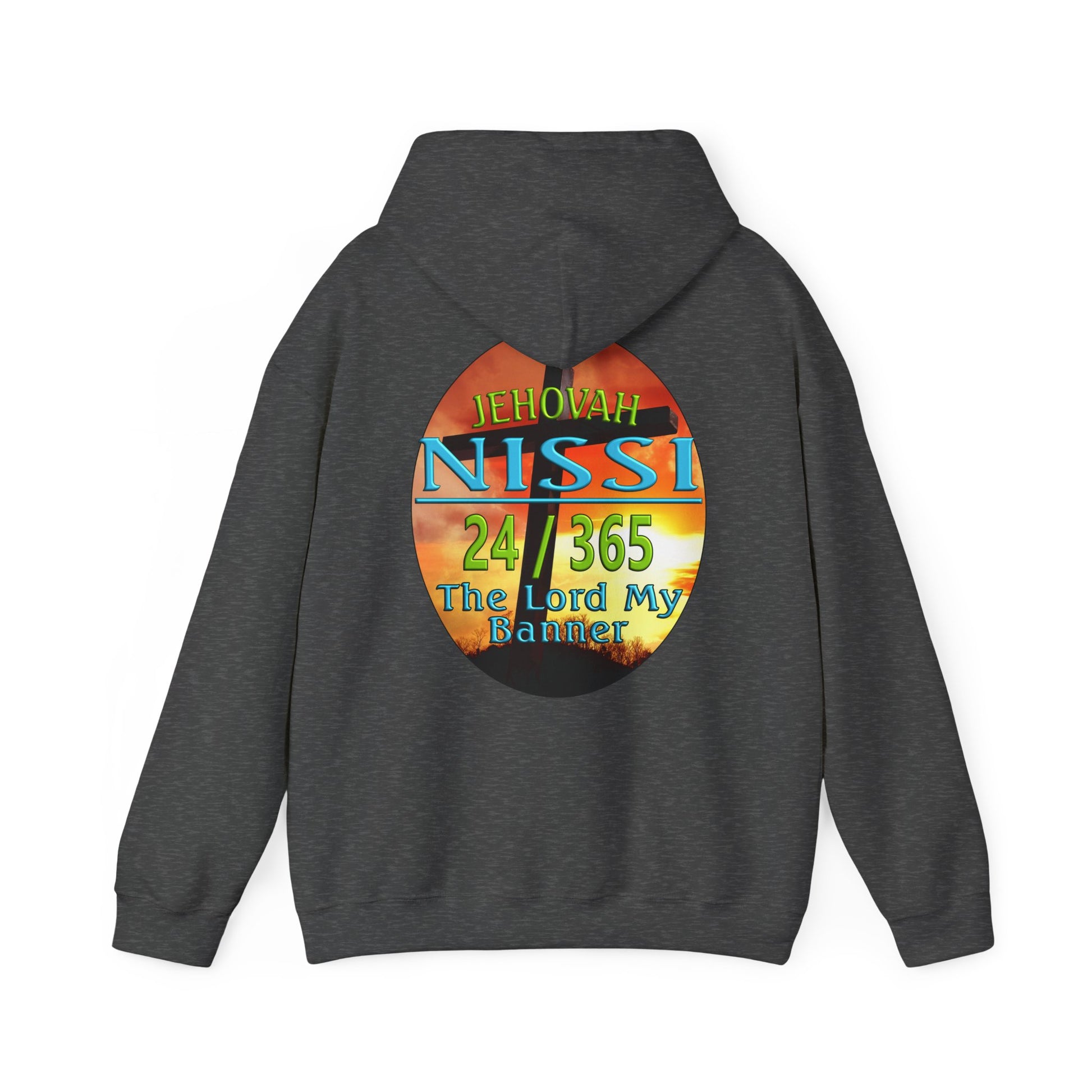 This Hoodie reflects the combination of Jehovah with the word "Nissi". “Nissi” means banner. Banner here is much like a flag. A flag is a representation of what we hold dear and we govern our lives to adhere to its ideals and values. We live under the direction and in the defense of that which the banner represents. In this case our banner is the Lord.