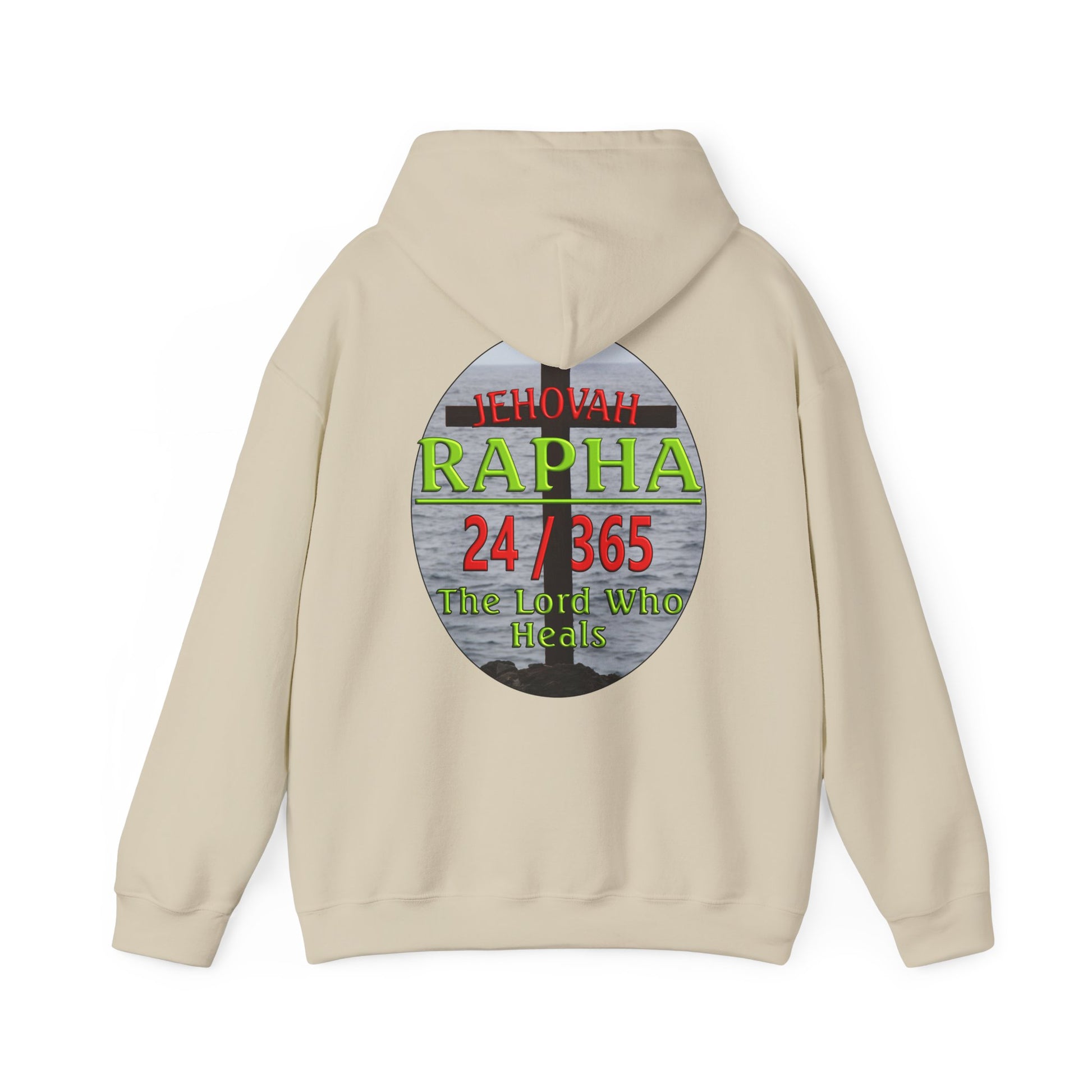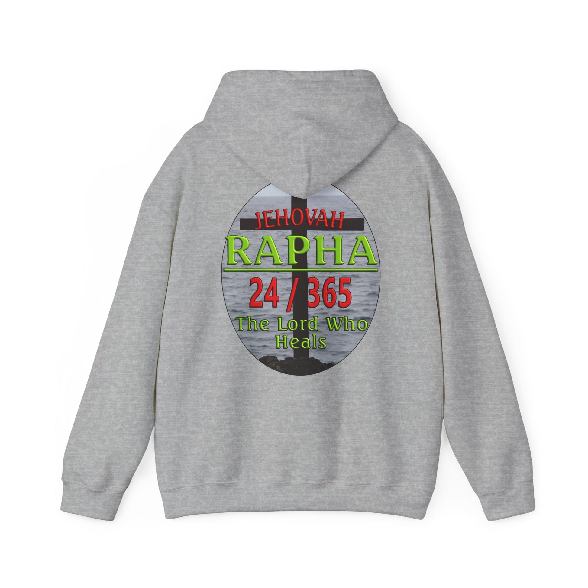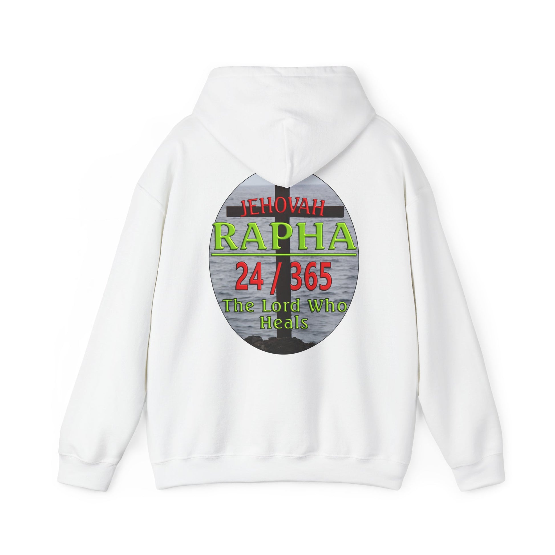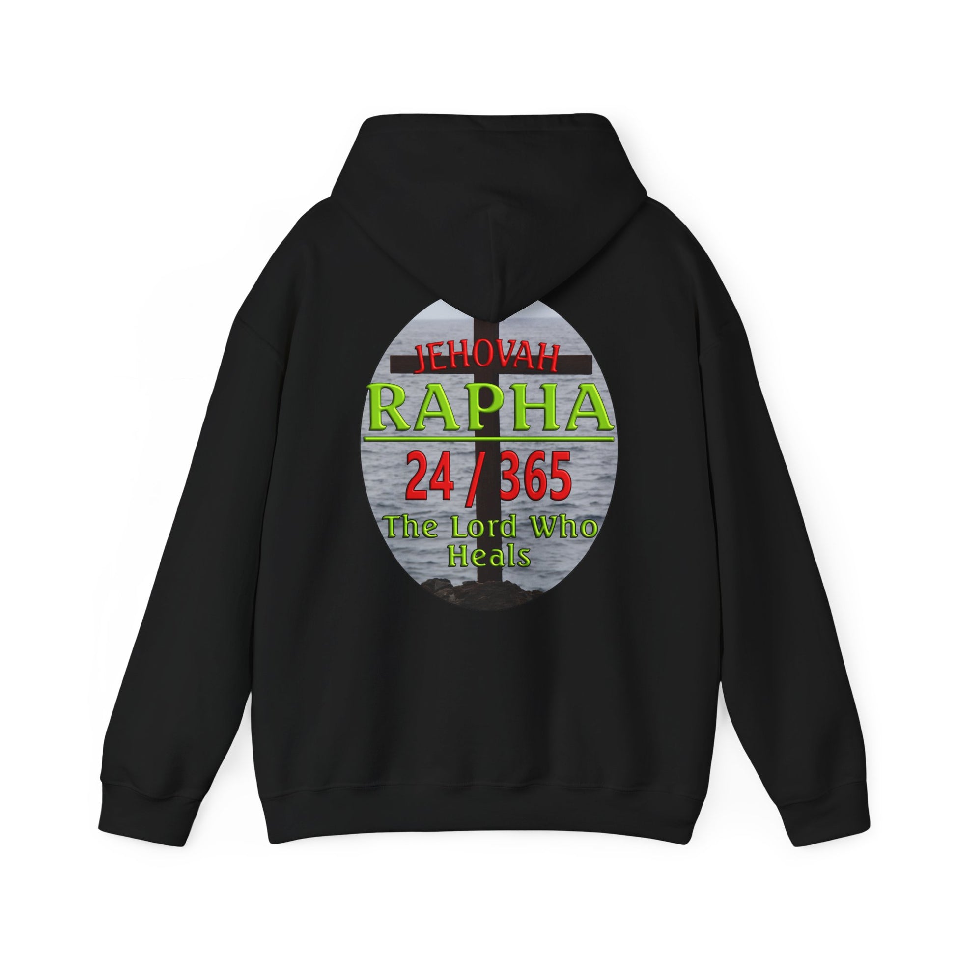 This Hoodie reflects the combination of Jehovah with the word "Rapha". "Rapha" means healer, and when "Rapha" is added to the name Jehovah, it means the eternal God is our healer. It also means that Jehovah is eternally our healer. He is our healer 24-365. There is no point during the day or throughout the year when He is not our healer.