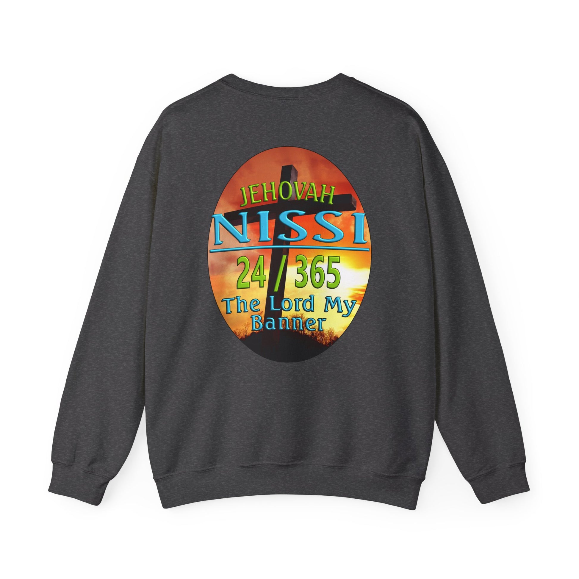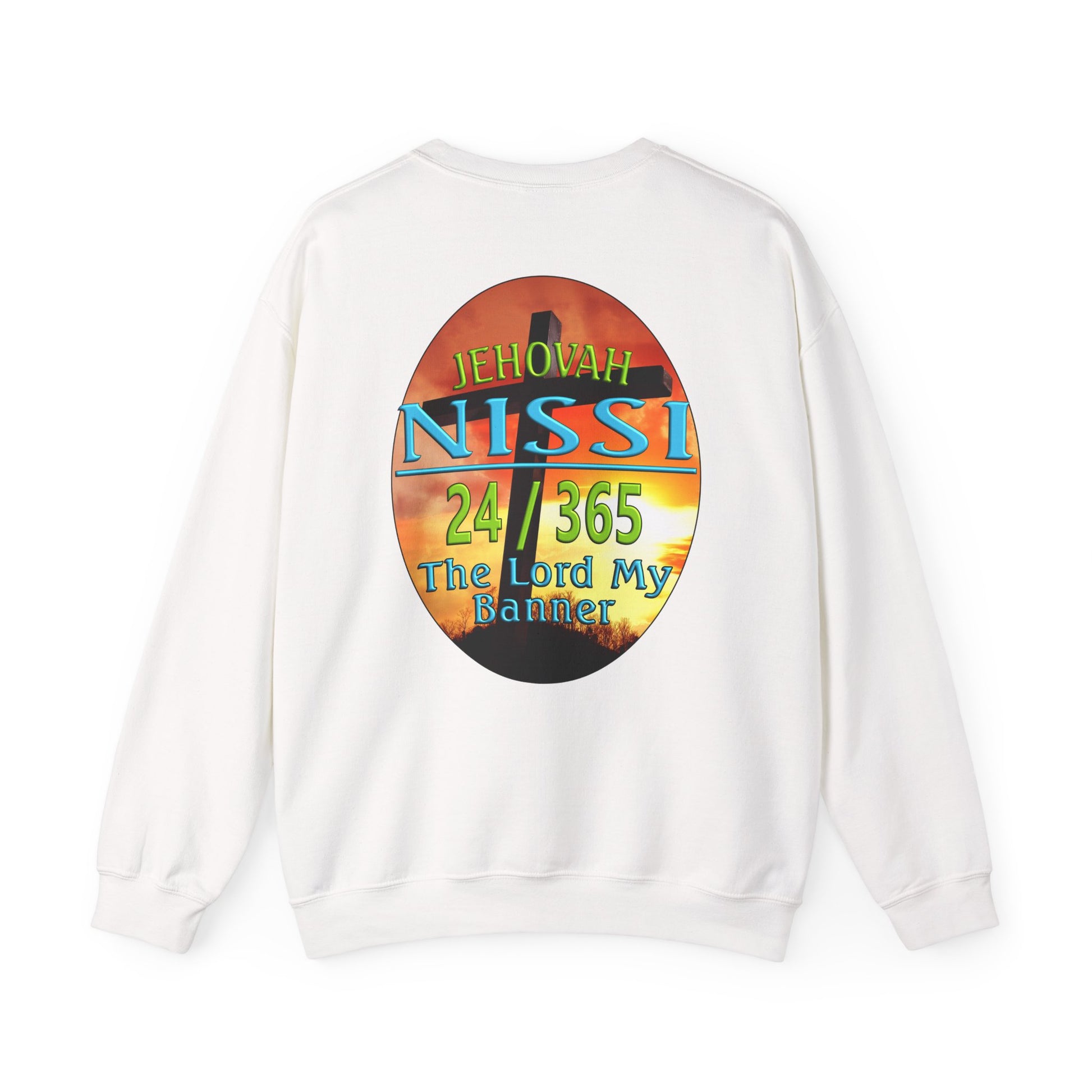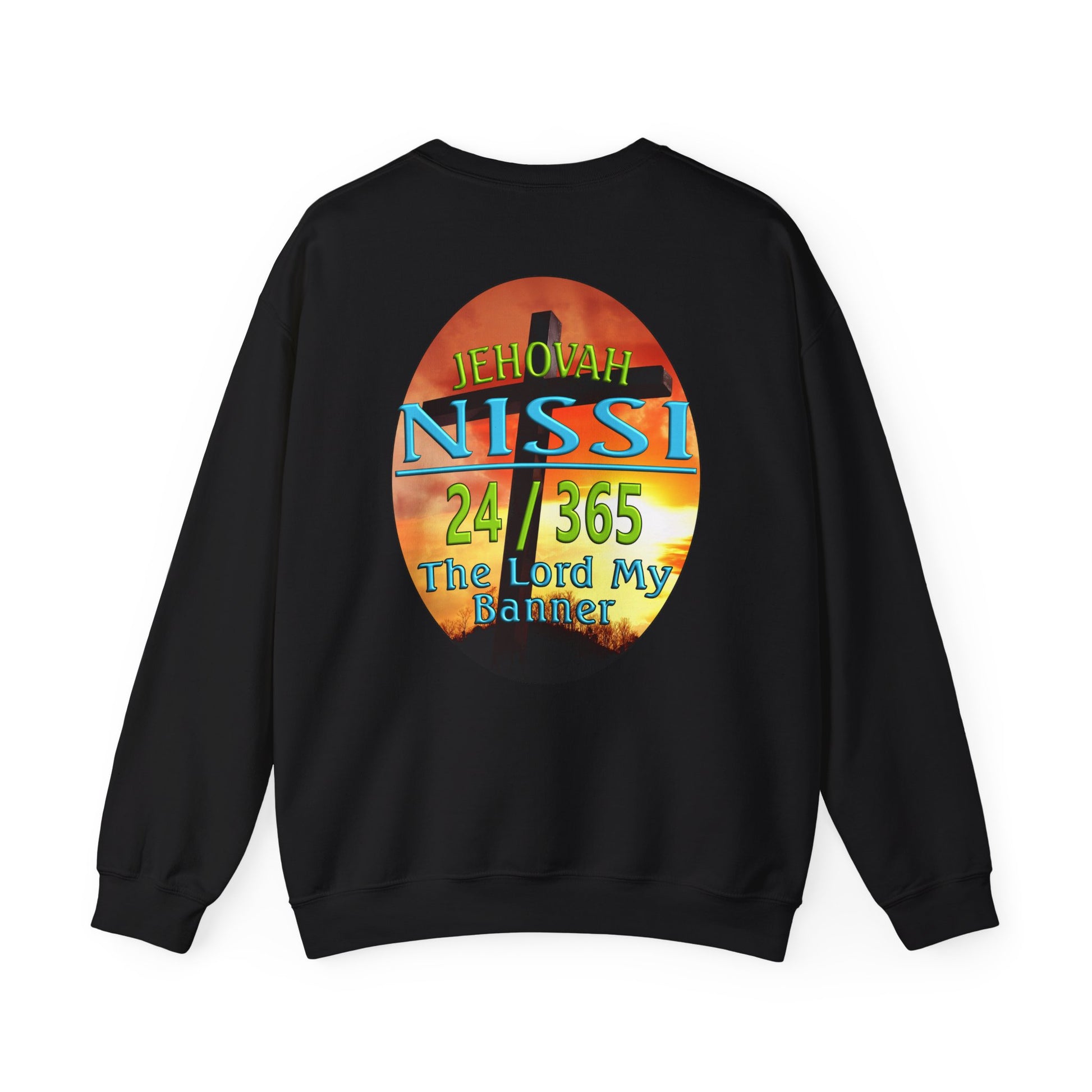 This Sweat shirt reflects the combination of Jehovah with the word "Nissi". “Nissi” means banner. Banner here is much like a flag. A flag is a representation of what we hold dear and we govern our lives to adhere to its ideals and values. We live under the direction and in the defense of that which the banner represents. In this case our banner is the Lord.