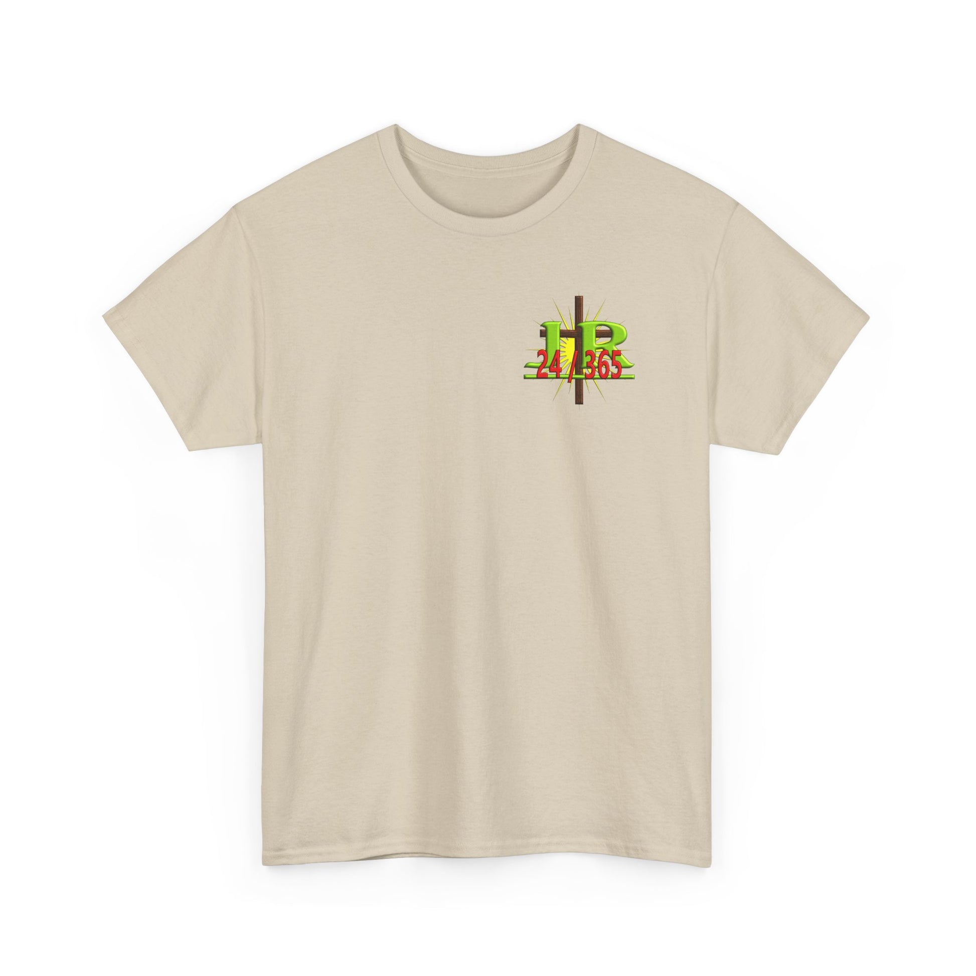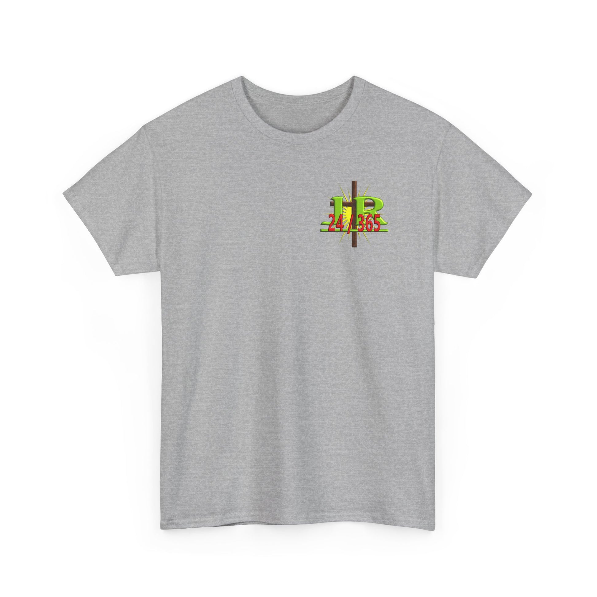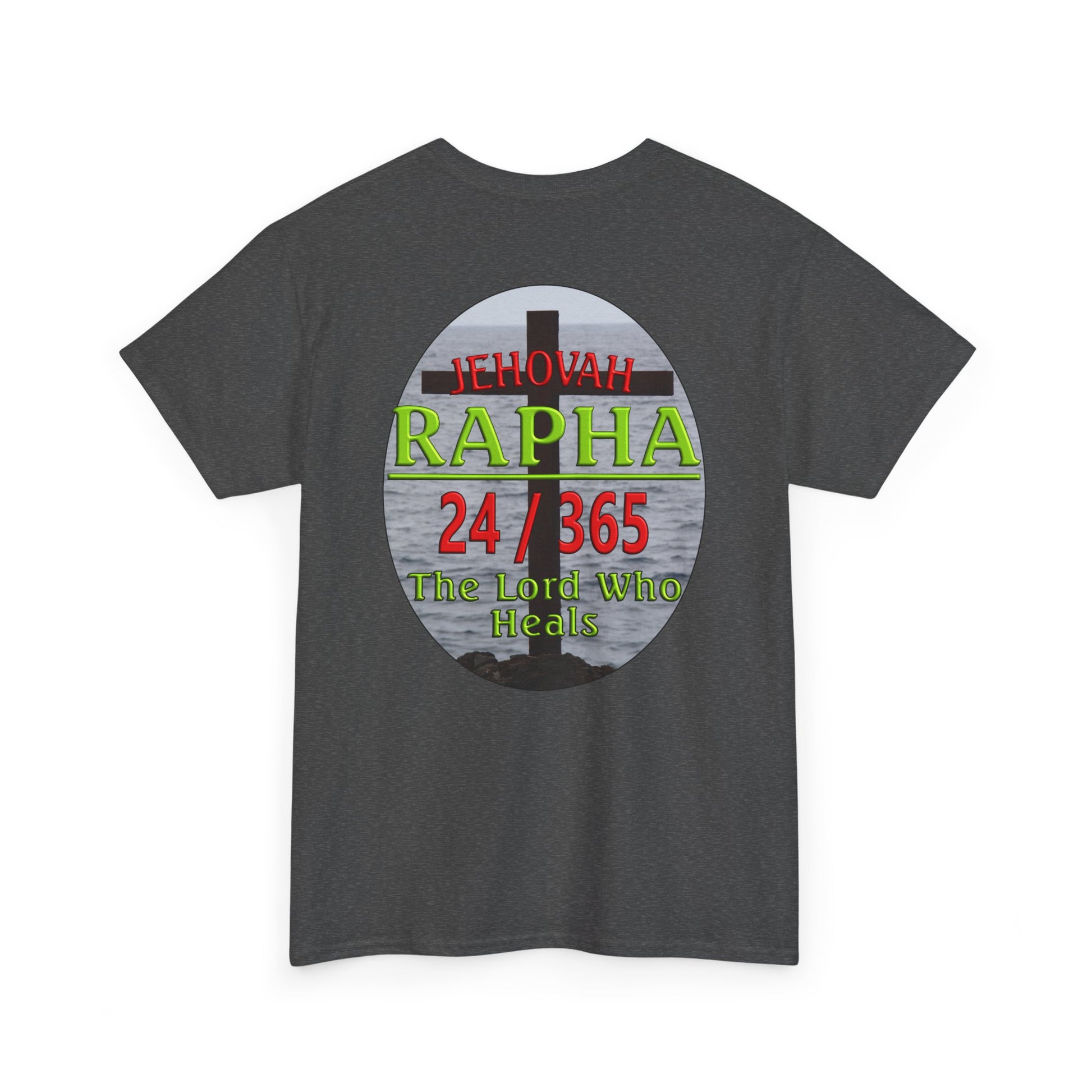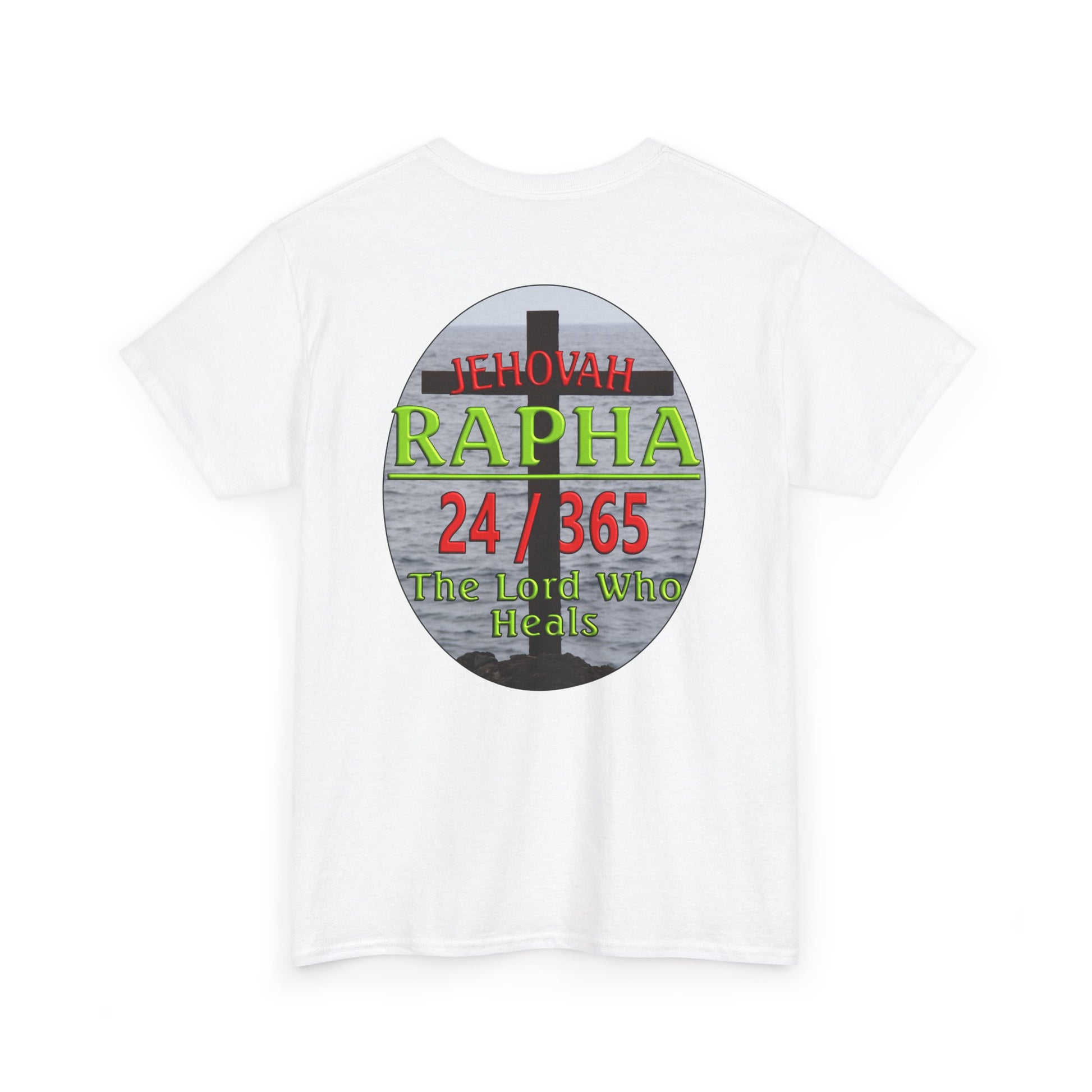This Tee shirt reflects the combination of Jehovah with the word "Rapha". "Rapha" means healer, and when "Rapha" is added to the name Jehovah, it means the eternal God is our healer. It also means that Jehovah is eternally our healer. He is our healer 24-365. There is no point during the day or throughout the year when He is not our healer.