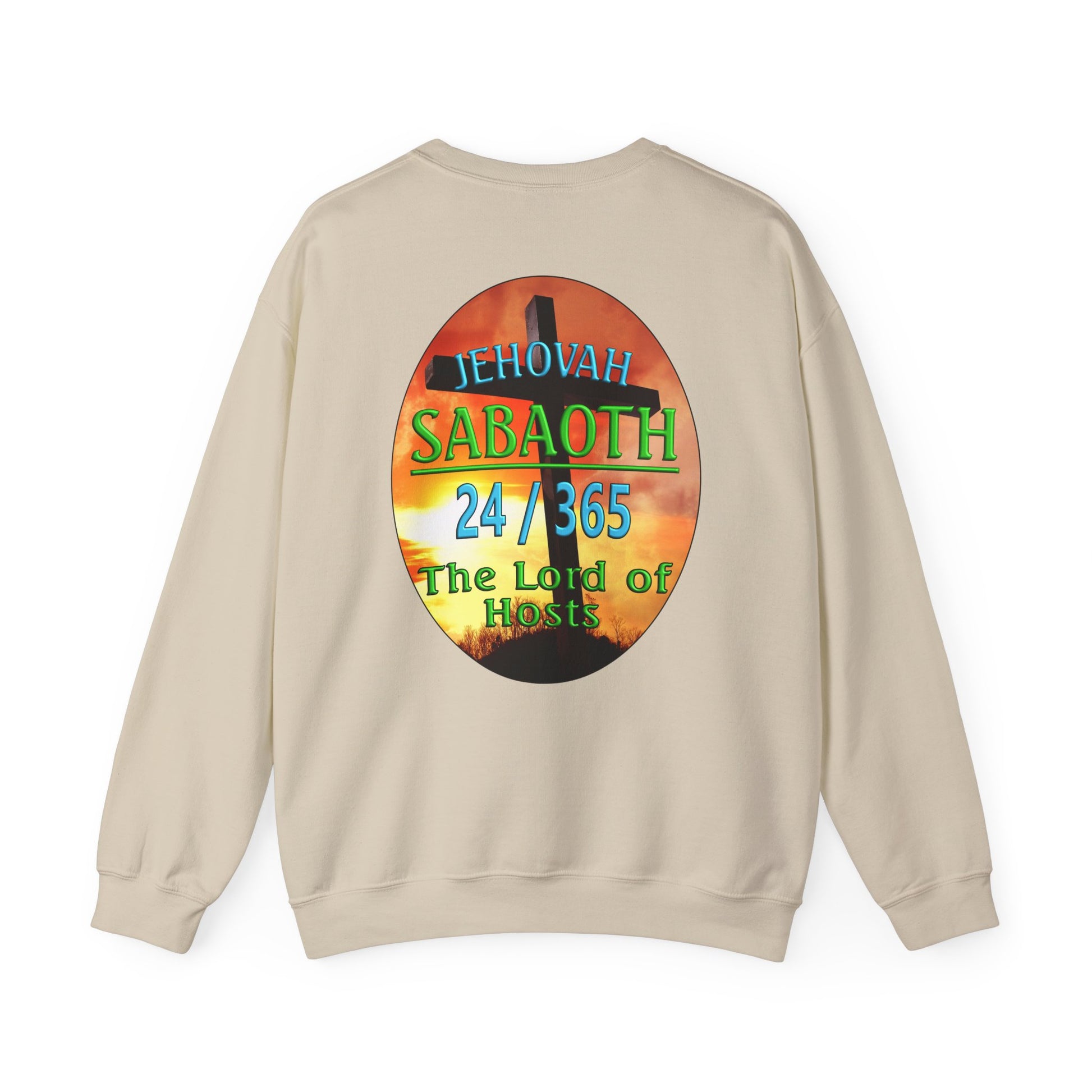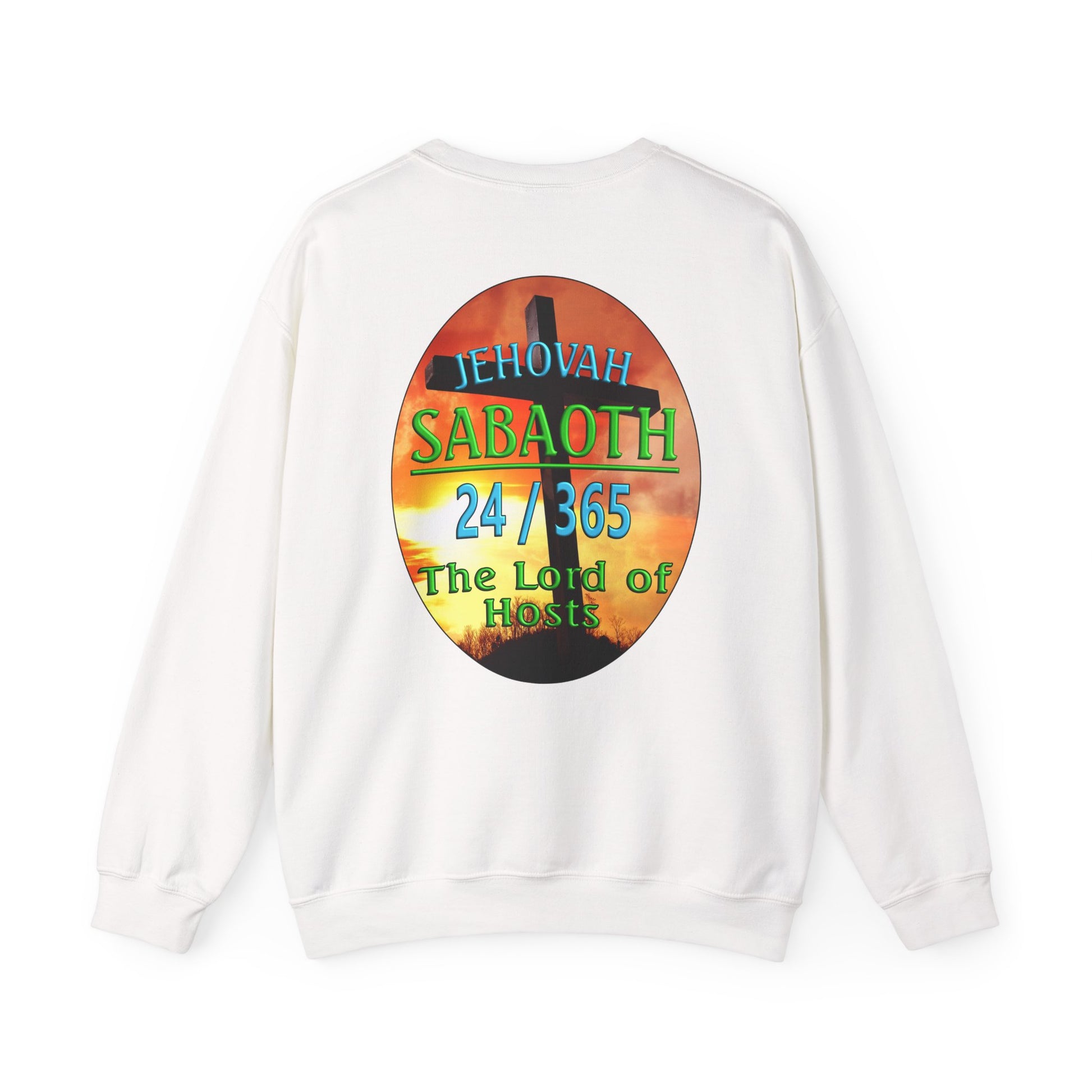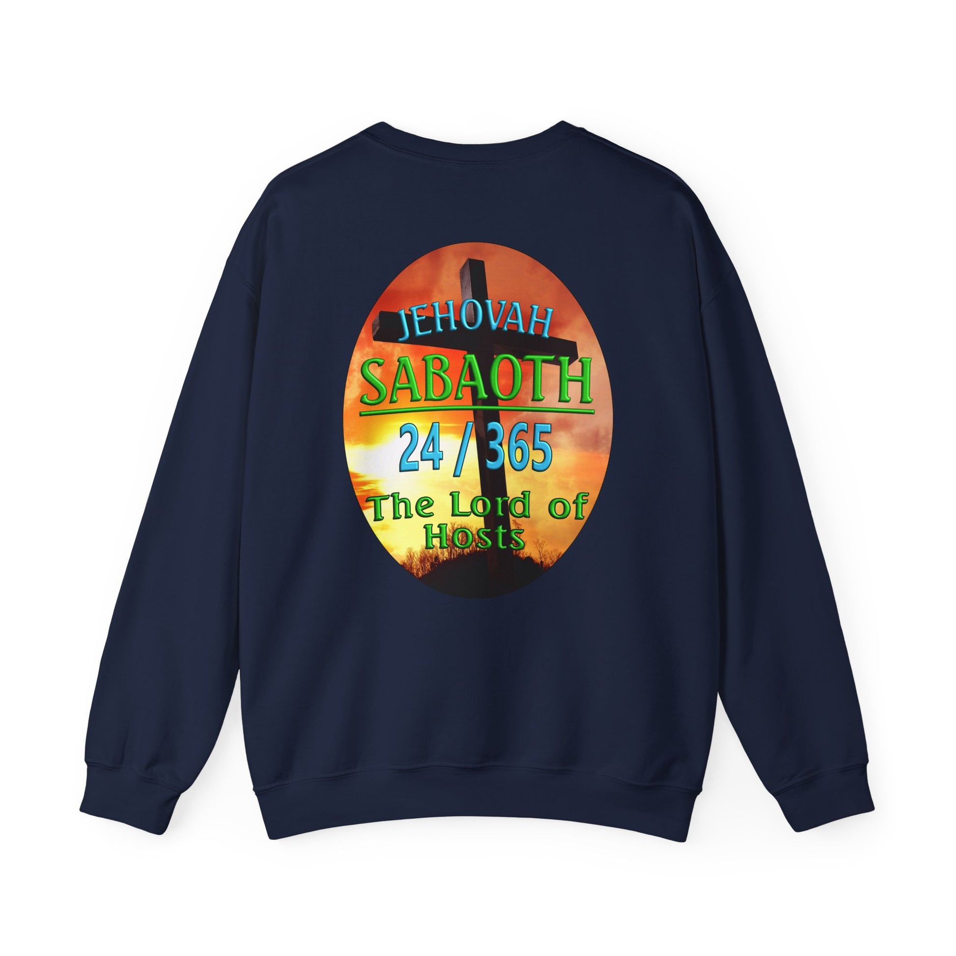 This Sweat shirt reflects the combination of Jehovah with the word "Sabaoth". “Sabaoth” means host. When Sabaoth is added to the name Jehovah, it means the eternal God is Lord of Hosts or Lord of Armies. This generally applies to Him being Lord of the hosts of heaven but is also applicable to the armies of earth. There have been no army which cannot be turned and be use by Him to bring about His purpose on this earth.